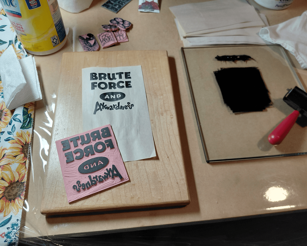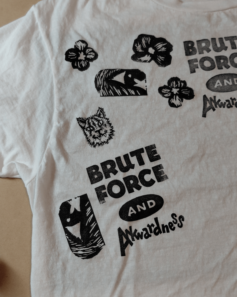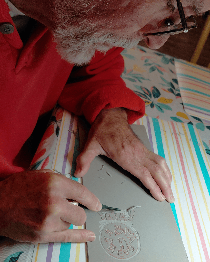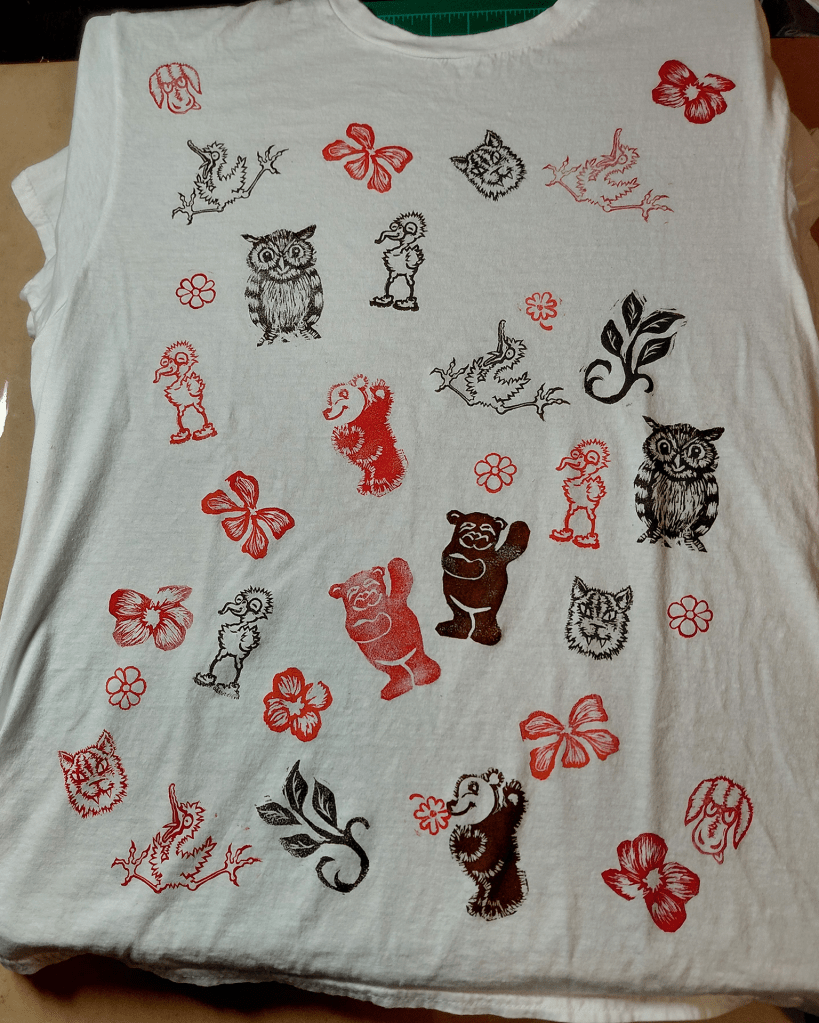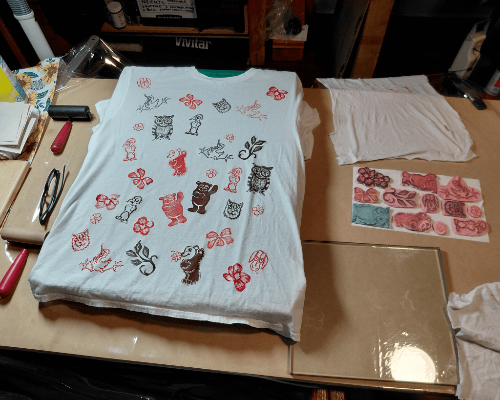 Now we’ve been trying our hands at carving and printing on textiles! The Tetra-Pak printing was very rewarding and this new adventure is proving to be as well. Now we have some prototypes to wear and show-off to indulgent family and friends who bring us new inspirations! At this point it’s just random playing around and having fun but that’s how the ideas and possibilities keep on coming!